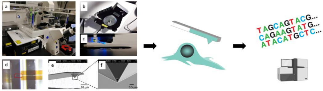 當然,如此精細的操作肯定需要更加精密、分辨率更高的儀器來進行。陳萬澤剛開始嘗試利用在細胞領域相對比較小眾的原子力顯微鏡來逐漸優(yōu)化自己的想法。原子力顯微鏡有一個很尖的硅探針,用于探測物質表面性質。陳萬澤團隊對這個探針進行了一系列的改造,包括表面活化、修飾等等,讓探針能夠在扎入細胞質的同時吸附出胞質內的RNA。但是改造的成本和探針成本都比較高,且成功率在當時還比較低。