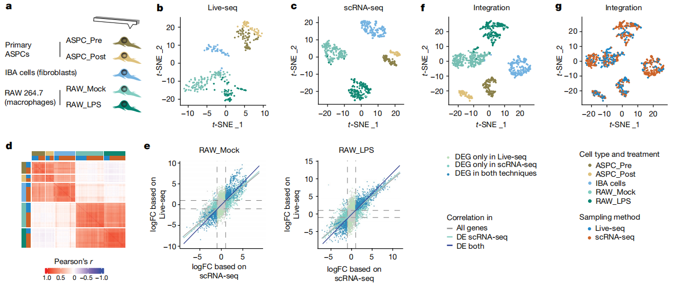 之后在了解到瑞士洛桑聯(lián)邦理工學院研發(fā)了一種可以吸出部分胞質的特殊的原子力顯微鏡(FluidFM,原子力顯微鏡與微控流技術的結合),兩個團隊順理成章的開始聯(lián)合攻關。最終完成Live-seq的改造,對五種類型共295個細胞進行了測序,發(fā)現(xiàn)Live-seq能夠有效區(qū)分不同類型的細胞,且平均每個細胞能檢測到約4112個基因的表達信息。文章中所用的細胞包括IBA(神經膠質細胞)、ASPCs(原代小鼠脂肪干細胞和祖細胞)、RAW264.7(單核細胞或巨噬細胞樣細胞系)、RAW-G9(紅色熒光標記的Tnf啟動子,便于下游功能分析)。