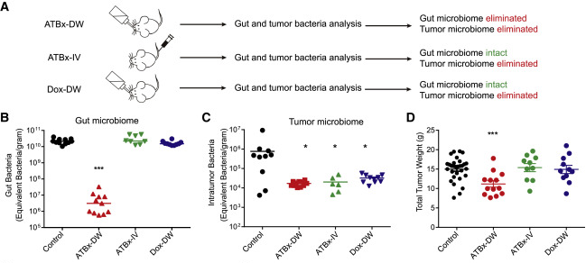 清除腫瘤內(nèi)的微生物會(huì)阻礙腫瘤的轉(zhuǎn)移,但不會(huì)阻礙原發(fā)腫瘤的生長(zhǎng)通過測(cè)試不同的抗生素組合和給藥途徑來選擇性地消除腫瘤駐留或腸道微生物群(圖3A)。研究發(fā)現(xiàn)使用雞尾酒抗生素(ATBx),通過飲用水(DW)可以有效清除腸道和腫瘤微生物菌群。當(dāng)ATBx經(jīng)尾靜脈靜脈注射時(shí),腫瘤菌群被清除,而腸道菌群保持完整(圖3B和3C)。通過DW給藥穿透細(xì)胞膜的抗生素多西環(huán)素具有與ATBx-IV相似的效果(圖3B和3C)。最重要的是,ATBx-IV和Dox-DW處理在腸道活菌數(shù)量、腸道微生物群譜和腫瘤免疫譜方面與對(duì)照組保持相當(dāng)(圖S3A S3D和S3F S3I)。結(jié)果發(fā)現(xiàn)ATBx-DW能有效地減緩自發(fā)MMTV-PyMT BTs的腫瘤生長(zhǎng)(總腫瘤重量為15±對(duì)照組為0.5g,而ATBx-DW為11±0.8g),而單獨(dú)用ATBx-IV或Dox-DW消除腫瘤微生物群并不影響腫瘤總重量(圖3D)。這表明腸道菌群在腫瘤生長(zhǎng)中起著重要作用,而腫瘤菌群則不然。