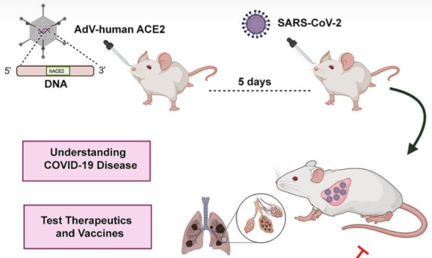 新型小鼠模型制備新冠小鼠模型除了轉(zhuǎn)基因的方式之外,還有用腺病毒載體轉(zhuǎn)導(dǎo)hACE2制備新冠模型小鼠的方法。2020年6月10日,廣州呼吸疾病國(guó)家重點(diǎn)實(shí)驗(yàn)室趙金存教授團(tuán)隊(duì)聯(lián)合多家單位共同發(fā)表了利用腺病毒載體制備的新冠小鼠模型,如下圖所示,該研究通過復(fù)制缺陷型腺病毒(Ad5-hACE2)將外源hACE2通過鼻內(nèi)轉(zhuǎn)導(dǎo)的方式遞送入C57BL/6和BALB/c兩種品系及相應(yīng)基因敲除的小鼠中,對(duì)小鼠進(jìn)行攻毒實(shí)驗(yàn),通過免疫印跡和流式細(xì)胞術(shù)檢測(cè)hACE2的表達(dá)。