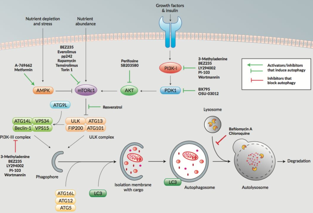自噬的關鍵過程:自噬5大關鍵過程:(1)自噬泡(phagophore)的形成:(2)Atg5-Atg12-Atg16L復合物形成并與自噬泡融合;(3)微管相關蛋白輕鏈3(microtubule-associatedprotein light chain3,LC3)由可溶解形式(LC3-I)轉變?yōu)橹苄问剑↙C3-II),與自噬泡結合形成自噬體。(4)自噬體捕獲需降解或清除的蛋白質、細胞器等物質;(5)自噬體與溶酶體結合形成自噬溶酶體。具體分子機制請看下圖。